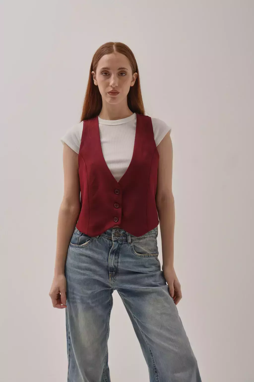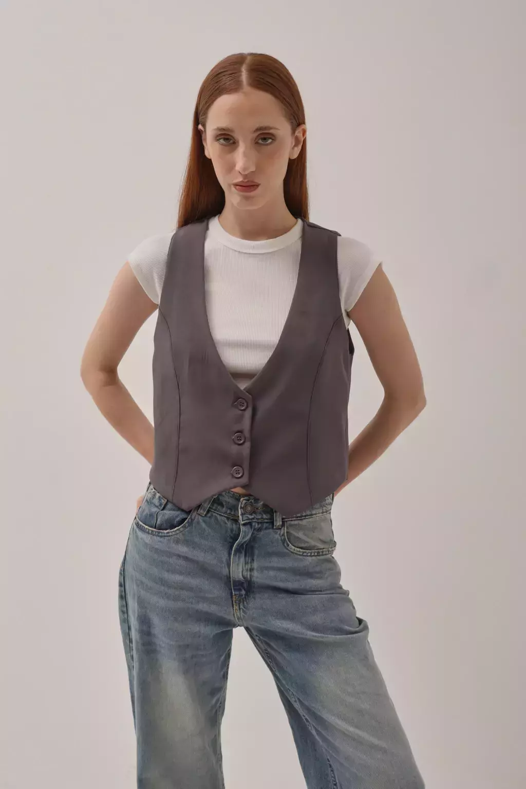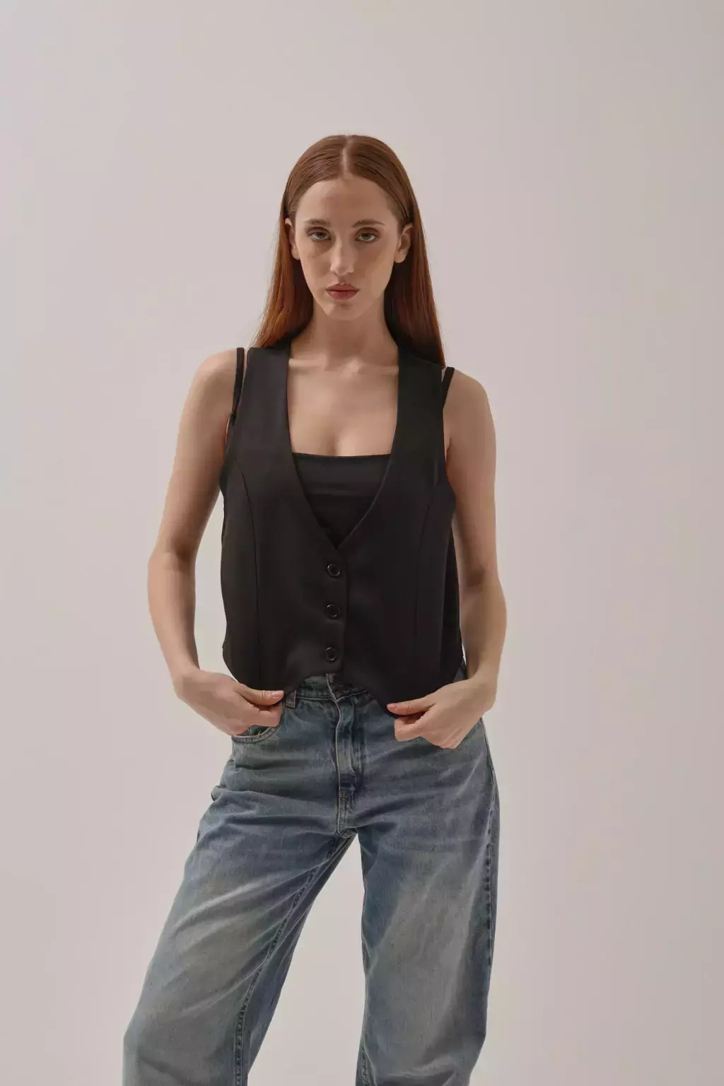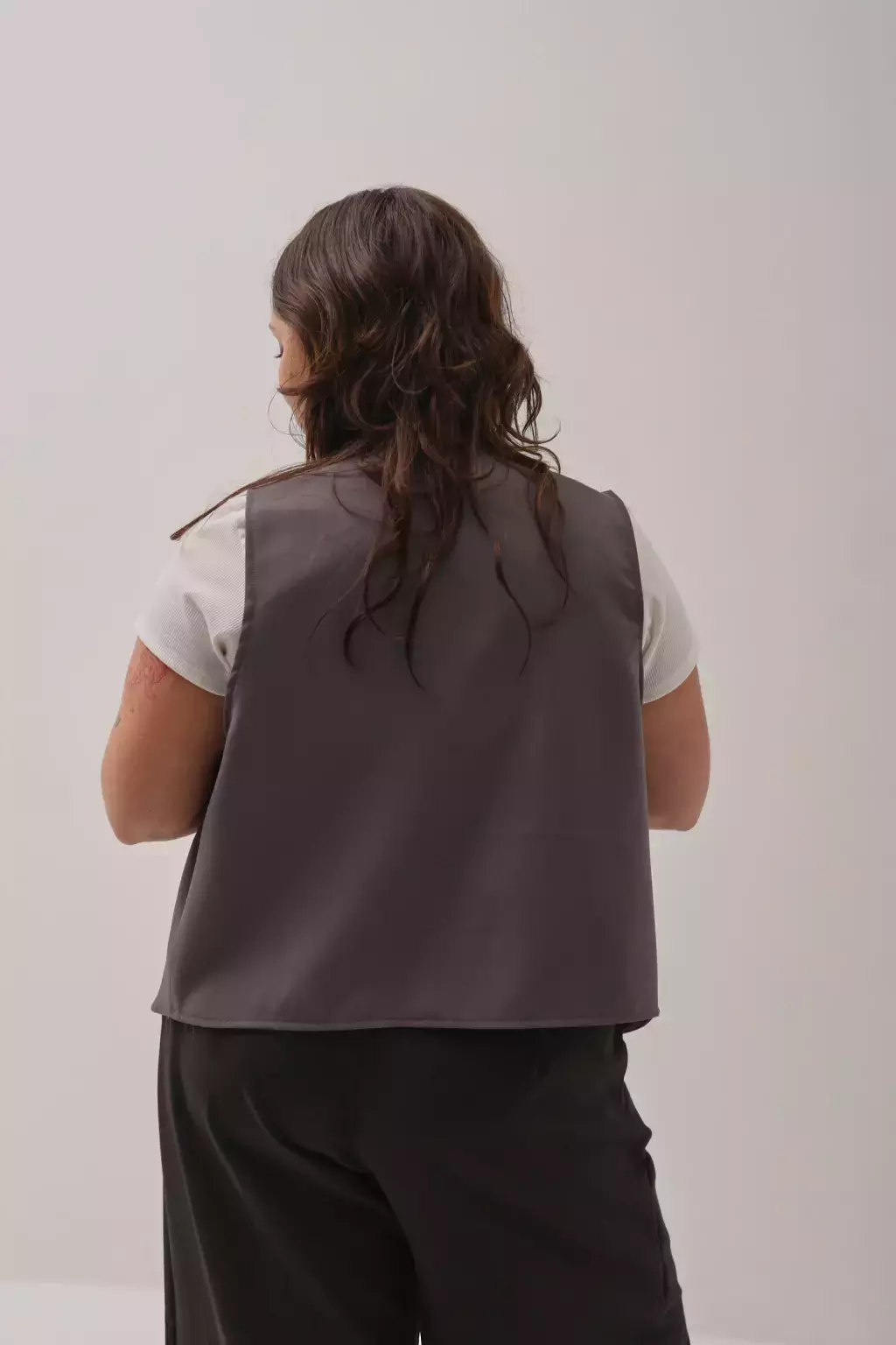 Este chaleco sastrero con botones es esa prenda comodín que no puede faltar en tu ropero. Su corte clásico y estructura sutilmente entallada lo hacen ideal para elevar cualquier look, ya sea de día o de noche.