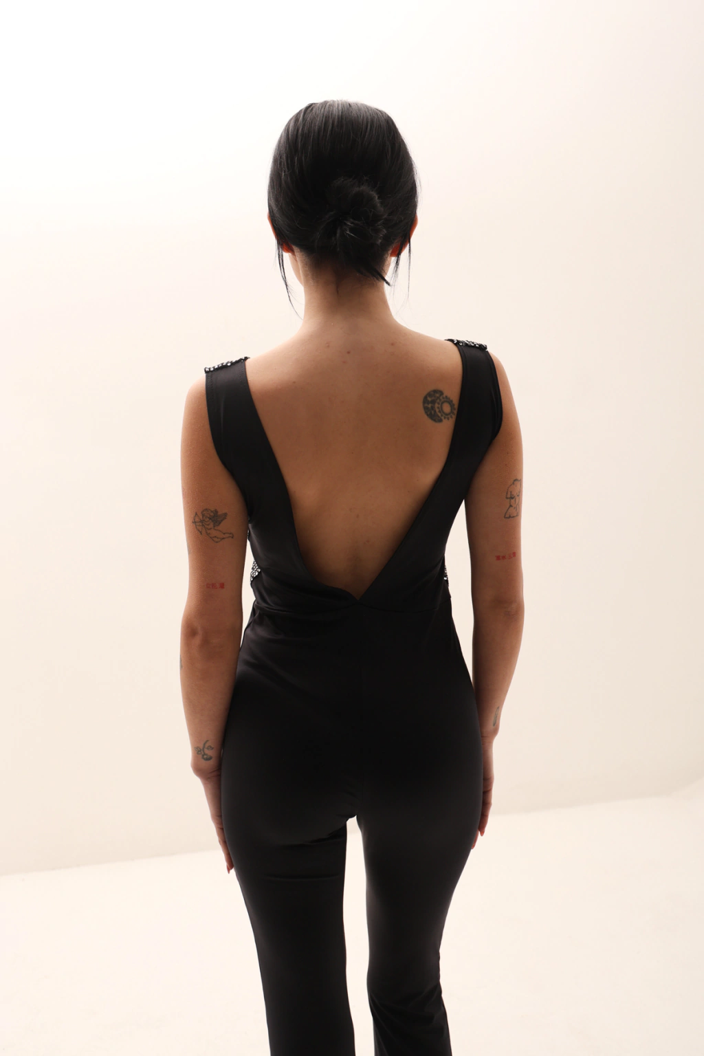 Mono largo de fiesta. Top de lentejuelas, escote abierto con recorte de tul y espalda super cavada; el pant es estilo calza oxford y un calce increíble. Si tenés una fiesta, no lo dudés. ¡Esta es tu prenda!