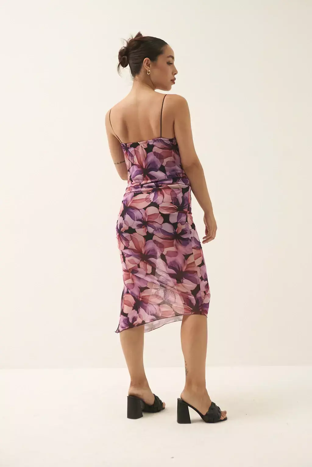 Vestido midi con breteles, cuello redondo y tajito. Sublimado con estampa de flores y lateral drappeado. Tiene forrería debajo del tul para que te sientas super cómoda al usarlo. Podés usarlo tanto para el día como para la noche, con zapas, borcegos o botas ¡Vas a brillar igual!